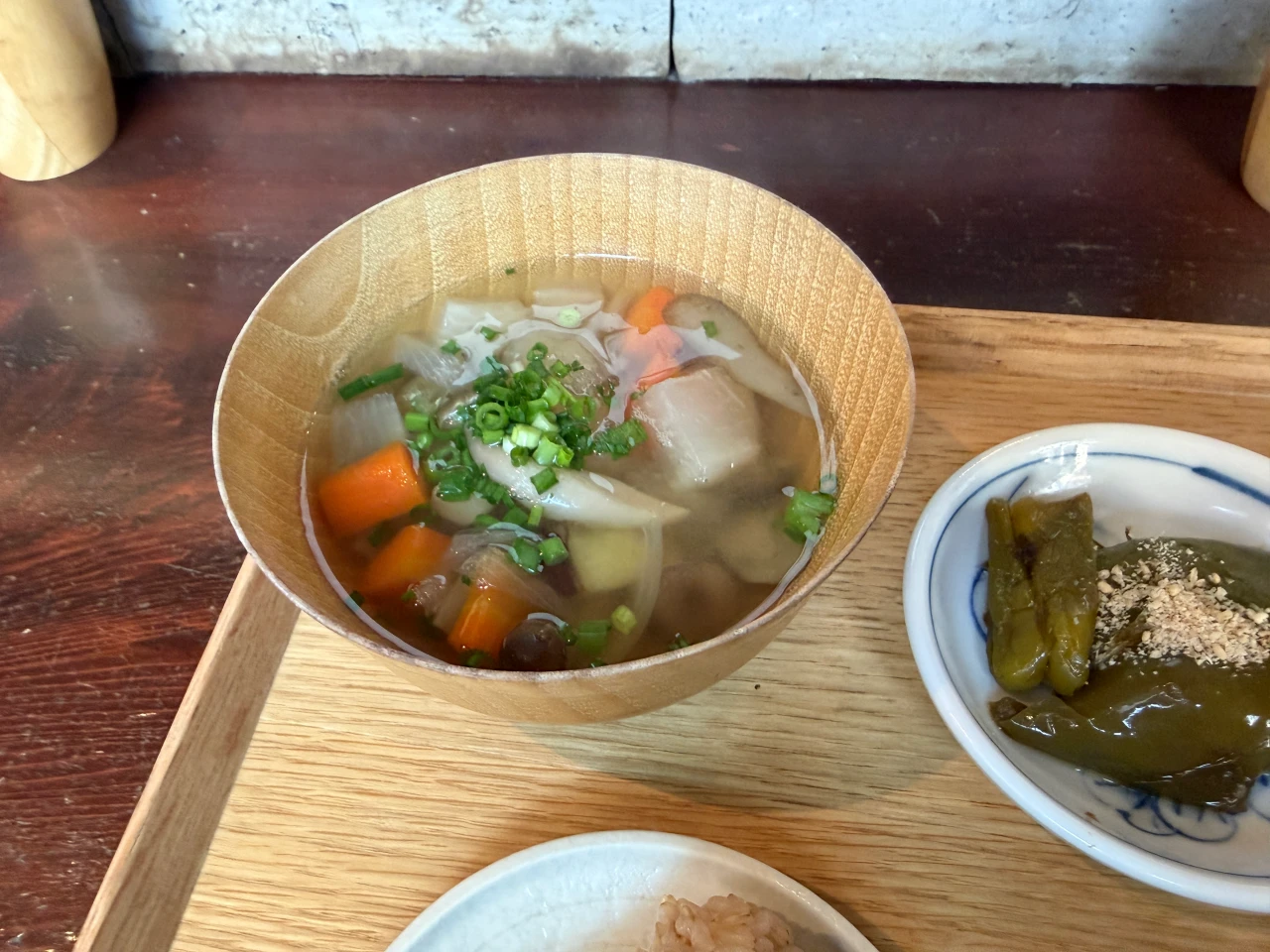おにぎりに寄り添うのは、木の器にたっぷり注がれた汁物。
