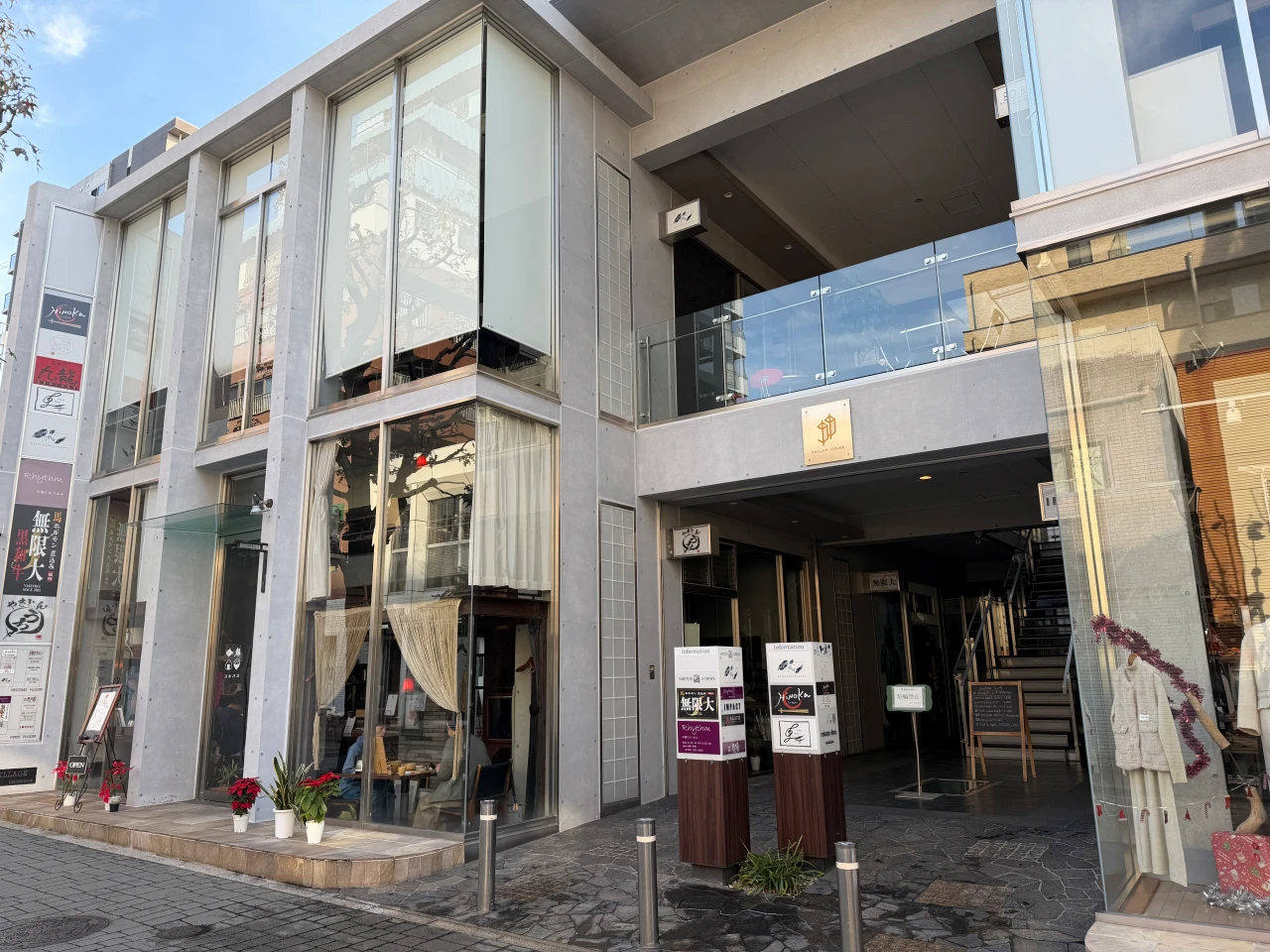お店は、並木坂に建つモダンなコンクリート打ち放しのビル「DOLLAR HOUSE(ダラーハウス)」の1階にあります。ガラス張りのスタイリッシュな外観ですが、入り口に飾られた真っ赤なポインセチアと、可愛らしいおにぎりのロゴマークが、訪れる人を優しく迎え入れてくれます。