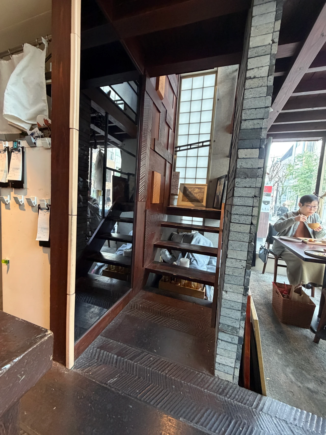 店内の奥には、2階へと続くような木の階段があり、限られたスペースながらも開放感のある造りが印象的です。