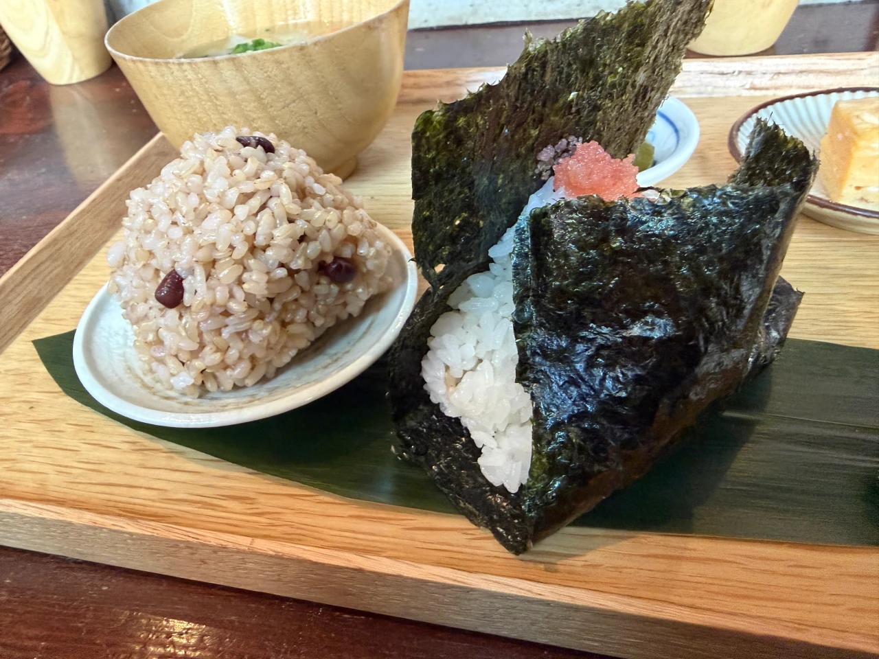 • 酵素玄米: もう一つは、小豆と一緒に炊き込まれた、もっちりとした食感の玄米おにぎり。噛めば噛むほどにお米本来の濃い旨みが感じられ、体が喜ぶような、力強い味わいです。