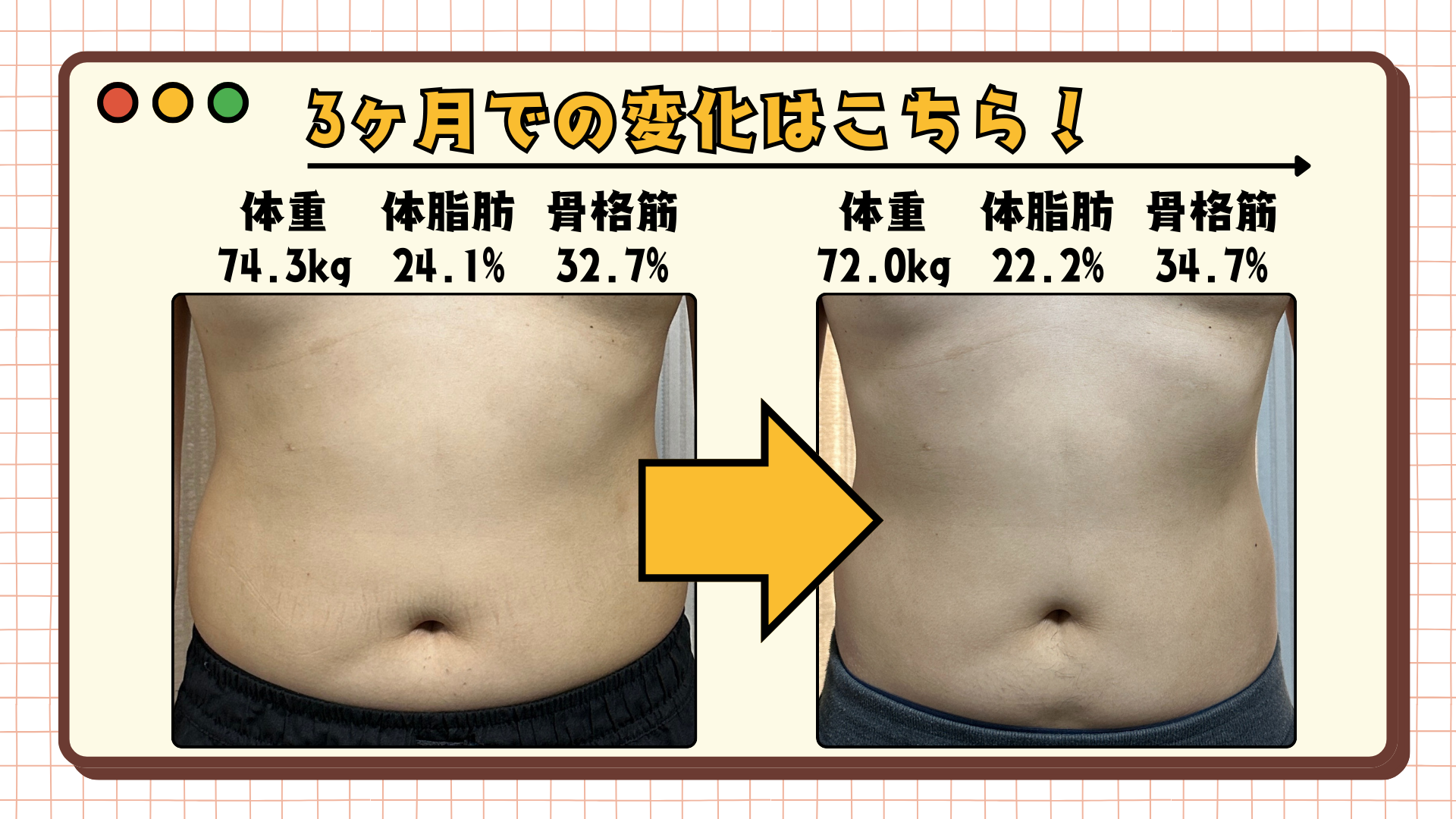 まずは一番気になる結果からお伝えします。 3ヶ月間、週に1回のトレーニングと、トレーナー指導による食事管理を行った結果がこちらです。